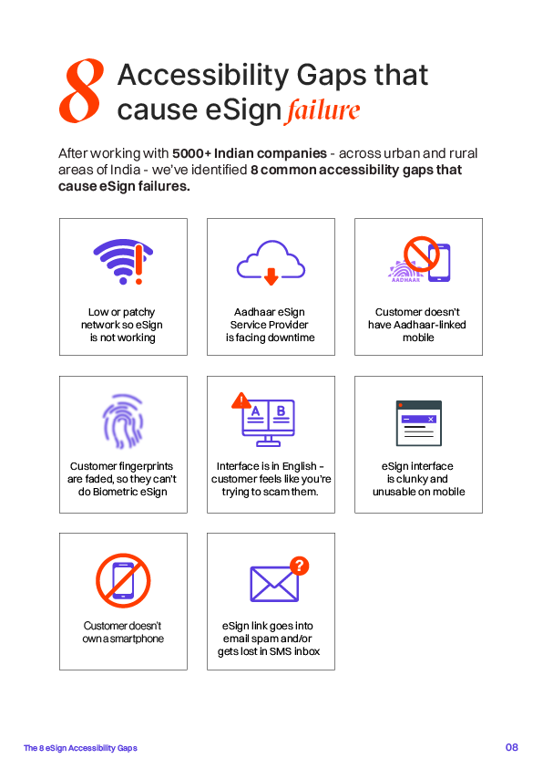 Because they fail to account for 8 challenges signers face on-ground when they eSign. See how to implement an eSign flow that solves these 8 challenges and actually works on ground.