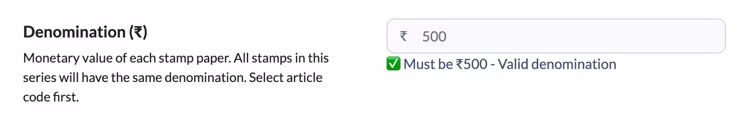 - The denomination field clearly shows the allowed range and you can only enter values within that range.