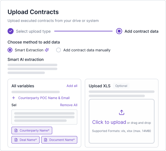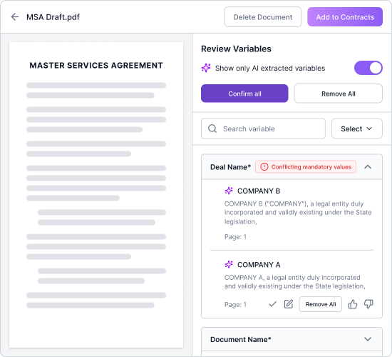 Upload existing contracts and auto-extract key fields to turn scattered documents into a clean, searchable repository