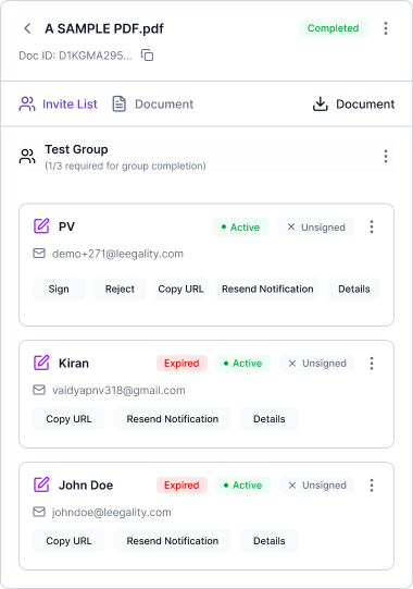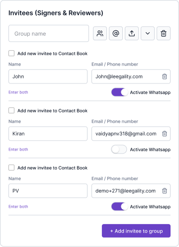 With Leegality Group Invites, you can create a group of all the signatories - so any time a critical document is executed they all get the link to eSign or review. You can set the minimum number of signatories who need to sign or review. As soon as that number of signatories eSign or review - document execution goes ahead, saving your agent hours spent chasing each signatory one-by-one.