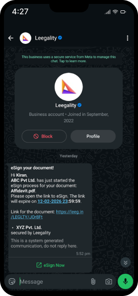 With Leegality WhatsApp Pings, your eSign links, reminders, and completed documents are delivered where your customers actually are — on WhatsApp.